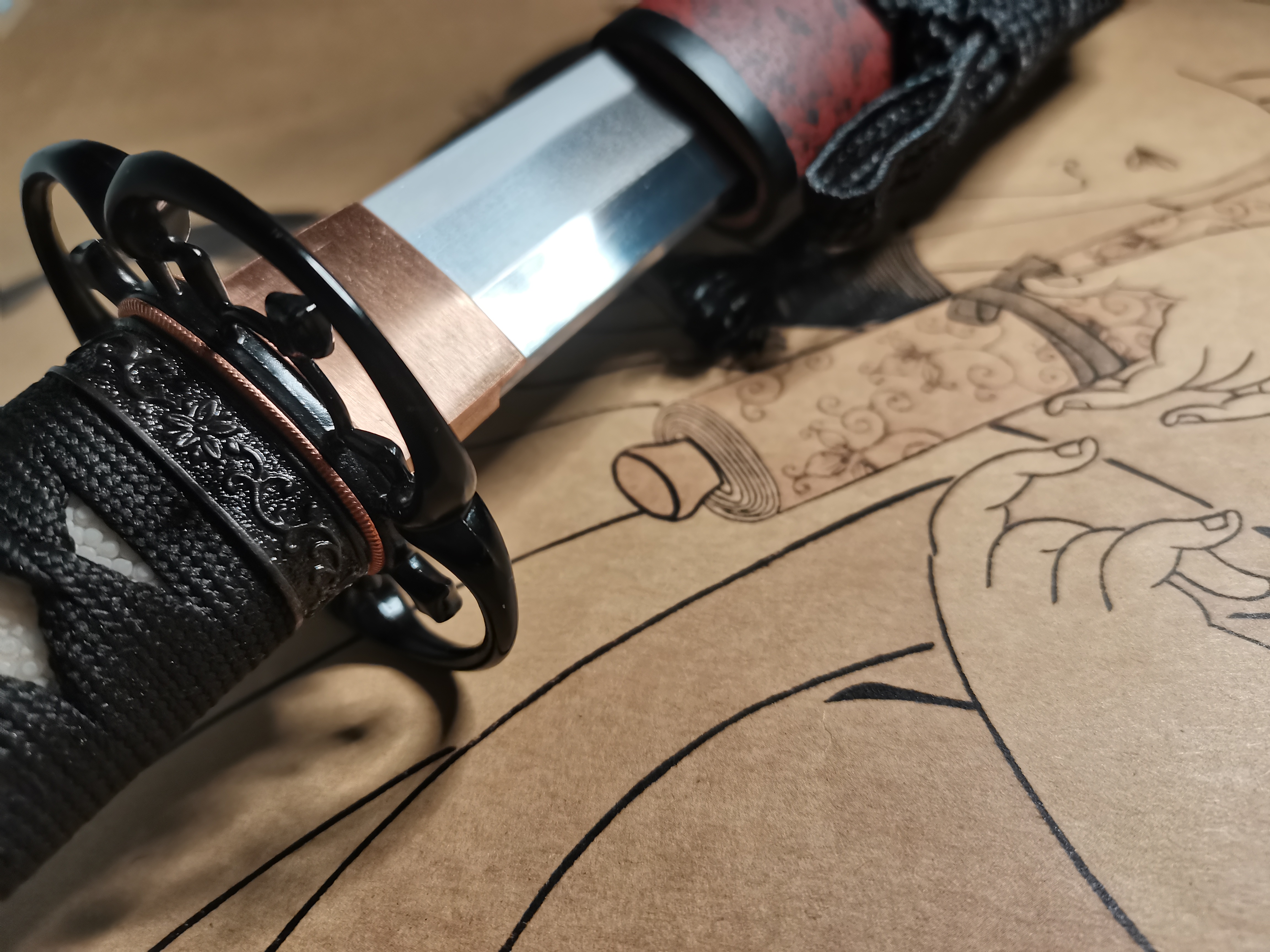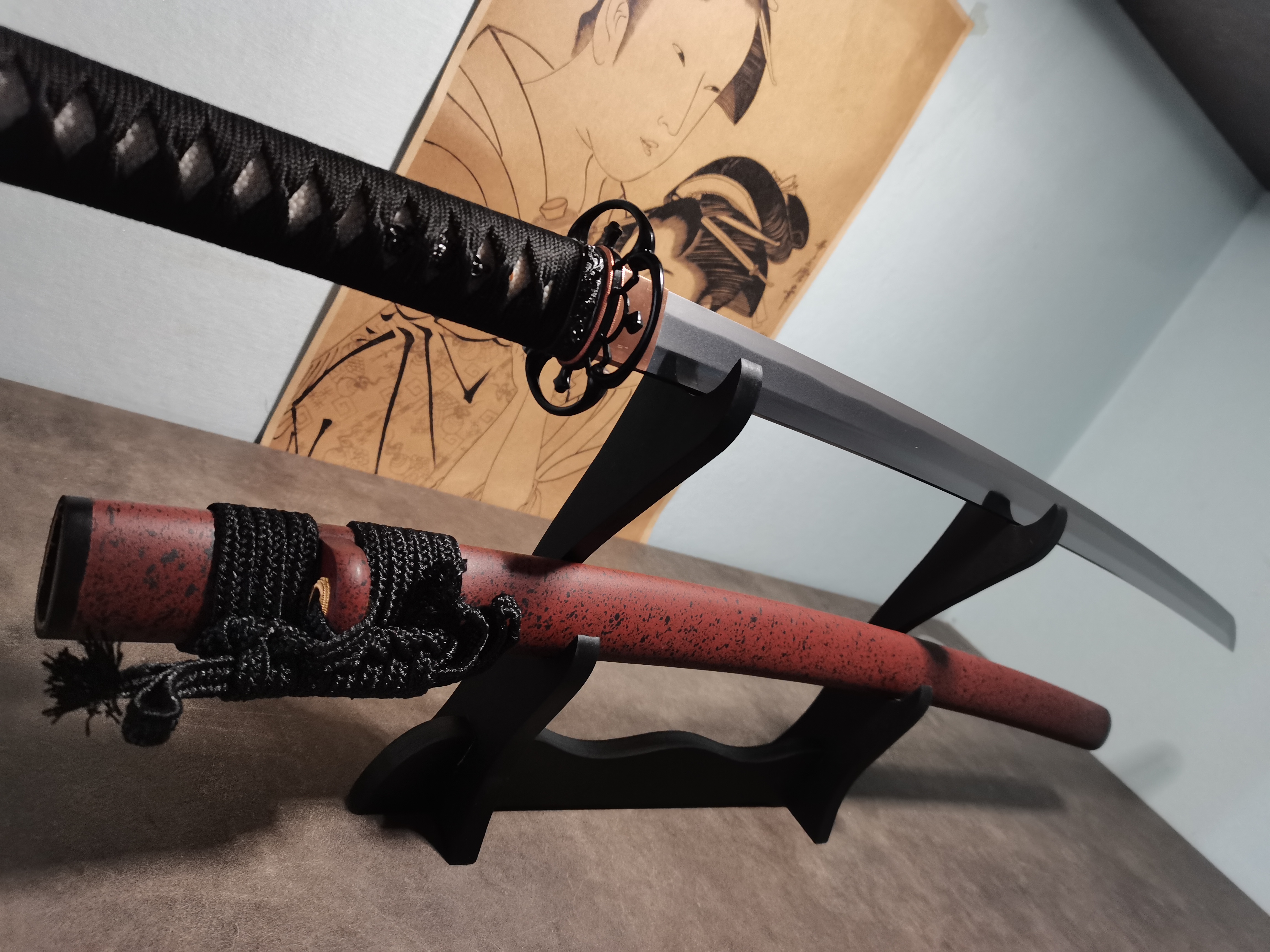 I bought this sword to decorate the display cabinet at home, and it looks really good when placed there. The pattern on the blade has a strong sense of layering under the light, and the color of the crucible steel is very authentic, not the kind of cheap bright color. The edge pattern from the Clay Temper process is very clear, like having its own unique lines, which is quite special. The craftsmanship of the scabbard is also good; the wood is solid, the paint on the surface is evenly applied with no bubbles. It has a good weight in the hand, not flimsy at all, so you can feel that the materials used are genuine. The logistics packaging was also careful—it was covered with two layers of cartons outside, and there was foam inside to fix it, so there was no damage at all when received.