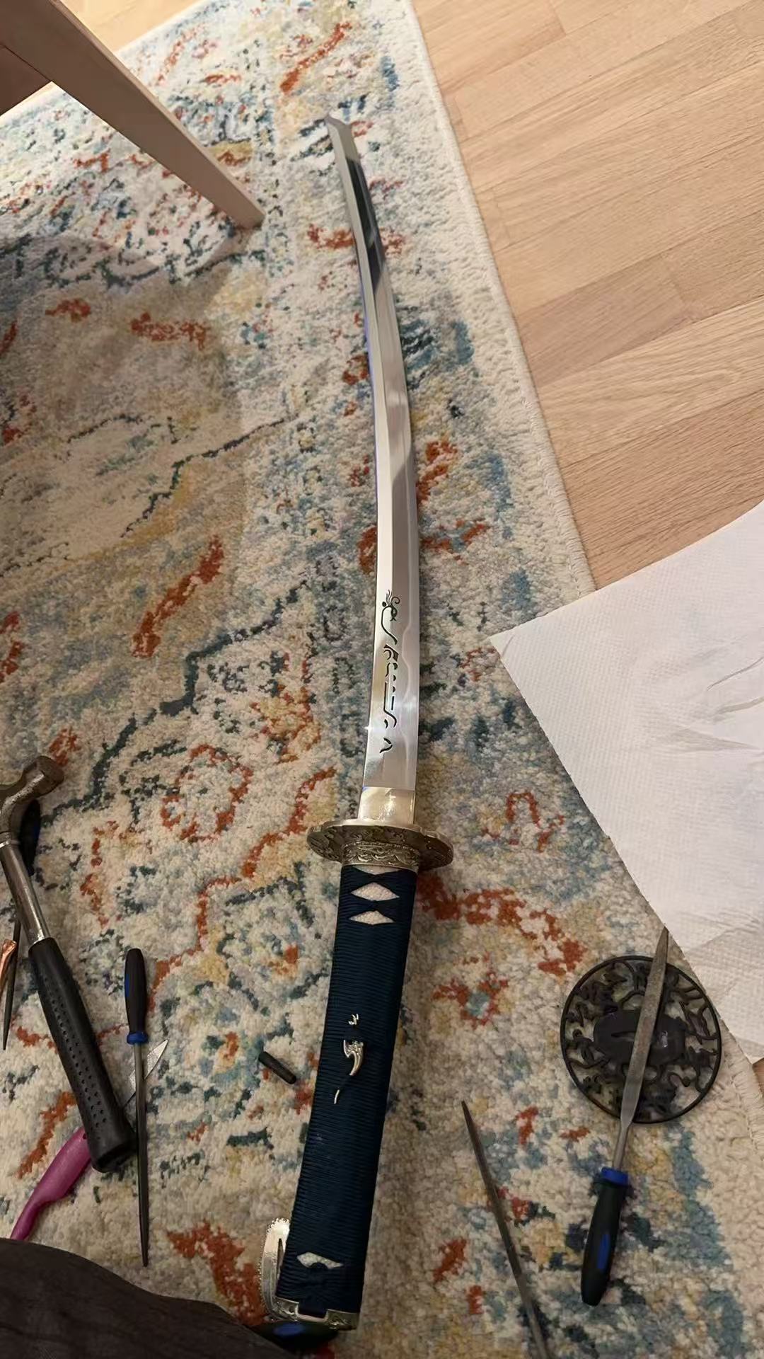 I’d had my eye on this crucible steel samurai sword for ages, and finally purchasing it did not let me down at all! There’s not a single flaw to pick out, from the material to the craftsmanship. The Sashikomi polishing is absolutely on point—the blade is so shiny it can reflect a person’s silhouette, yet it doesn’t look gaudy; instead, it exudes a calm, solid texture. The edge is ground to a sharp finish; I tested it on cutting paper, and it sliced through cleanly and smoothly without any hesitation. The cord wrapping on the hilt is tight yet comfortable to hold—it’s non-slip and fits perfectly in the hand, so even holding it for a long time doesn’t feel tiring. Whether it’s for collection or occasional handling, this sword is more than up to the mark. I’ve already recommended it to my friends who love samurai swords!
