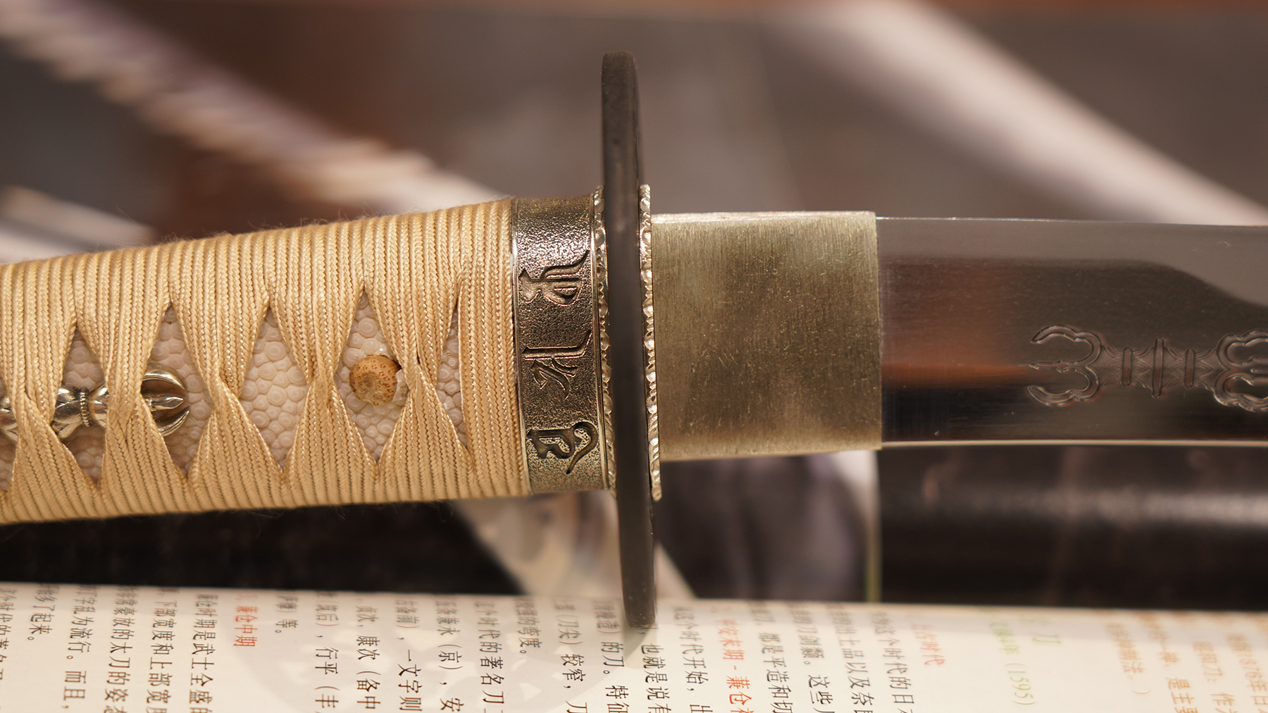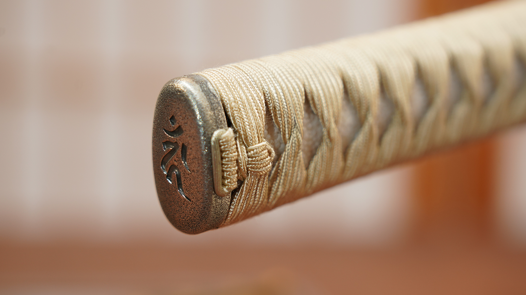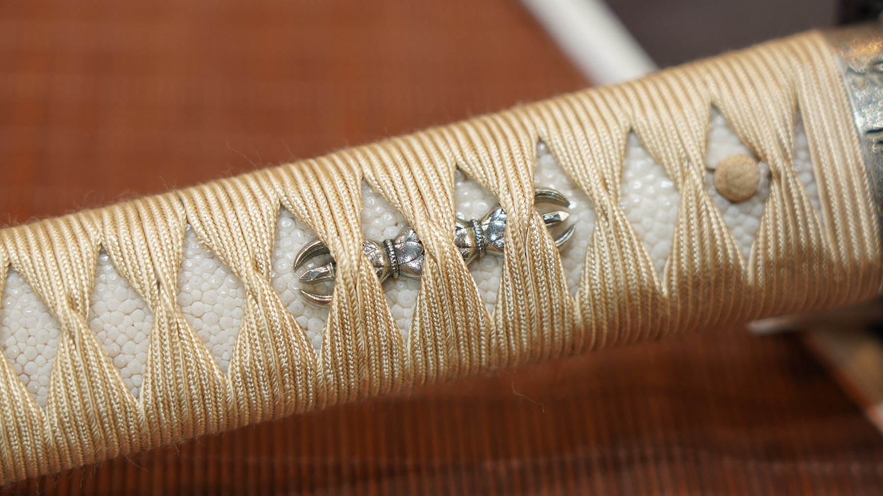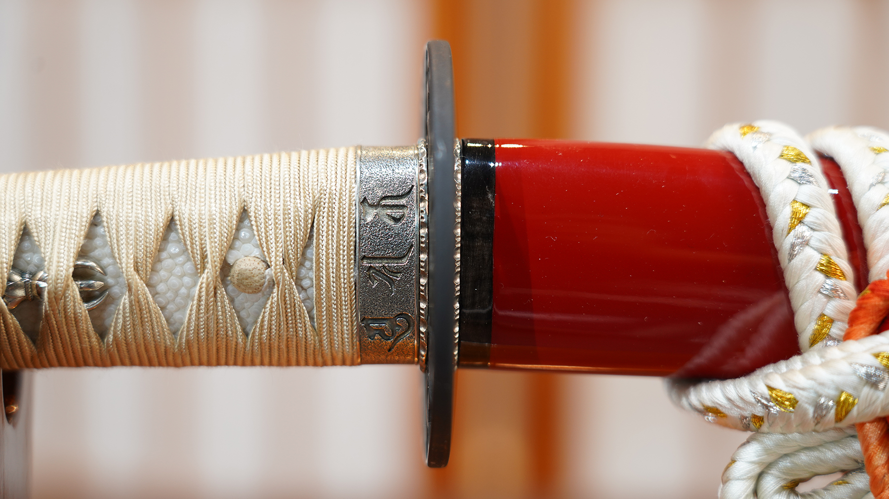 · Custom small-sized fuchi (antique brass with Sanskrit inscriptions) to fit the 2.8motohaba blade, paired with Vajra menuki (brass)
